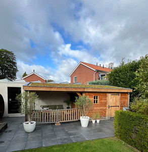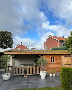 Wij hebben onlangs in Delden een tuinhuis met overkapping opgeleverd. Het tuinhuis is voorzien van een sedumdak en gebouwd met duurzame materialen, waardoor praktische ruimte wordt gecombineerd met een natuurlijke uitstraling.