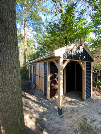 Vandaag hebben we deze houten tuinschuur geplaatst en opgeleverd in Laren. De tuinschuur gaat gebruikt worden als opslagruimte voor tuingereedschap en brandhout. De constructie is wederom gemaakt van eerste klas eikenhout met daartussen zwart gepotdekselde wanden. Het dak is afgewerkt met ovh gebakken dakpannen. De houten tuinschuur is aan de rechterzijde voorzien van een brandhoutopslag.